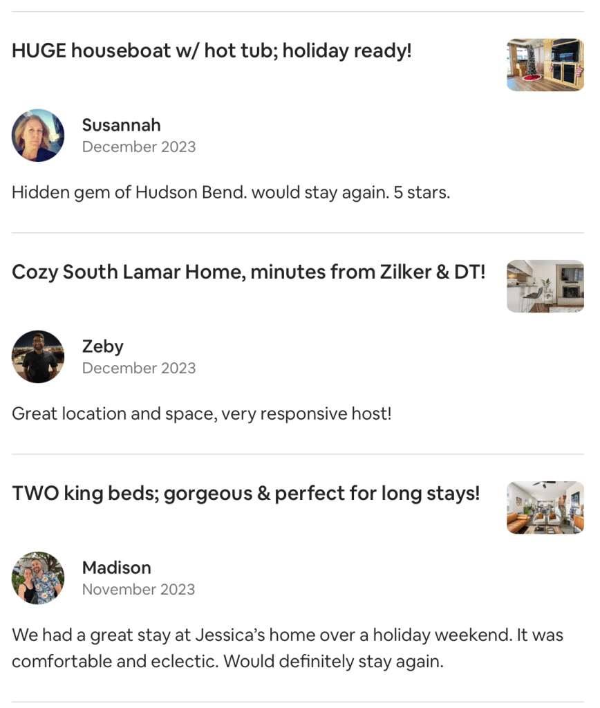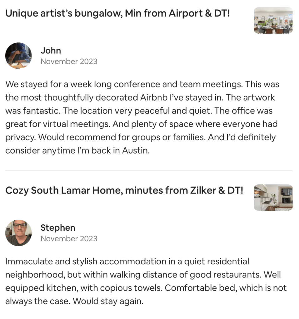 Are you a brand new owner, or a current host who wants to take a step back from their STR/MTR? Is your property located in the Austin, Chicago or NYC area? You are in the right place! We are highly trained in interior design, customer support, home repair & property management, so we can mange all of your STR/MTR operations, from creating a listing to replacing a toilet…and everything in between! We have a passion for offering the highest quality service, so we are confident that NO other company will treat your property & guests as well as we can.